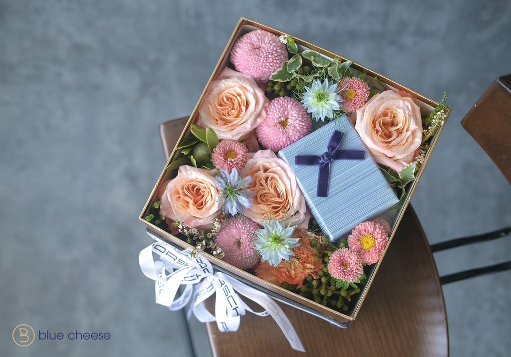 Hộp hoa bao gồm hồng Shimmer Ecuador kết hợp với các loại hoa lá phụ nhập khẩu khác.